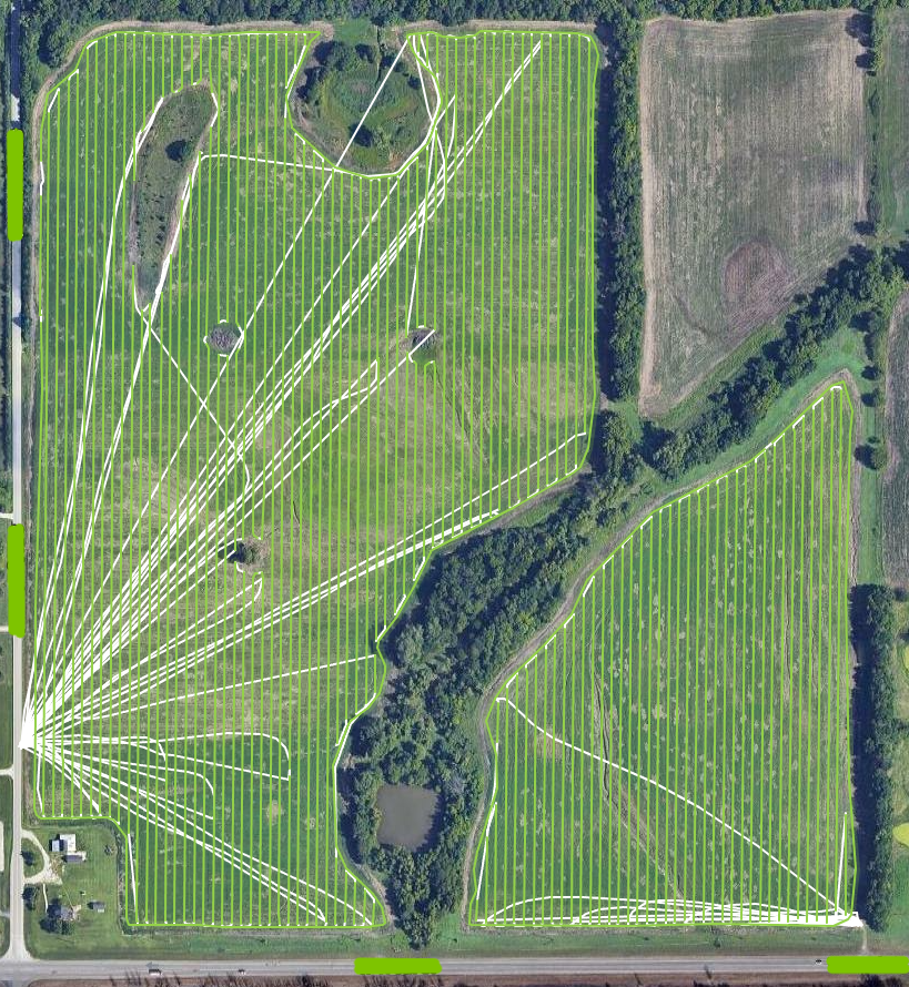 The drones will use the prescription map made in conjunction with the agronomist to apply treatments to the entire field, decreasing application volume where the crop is healthy.